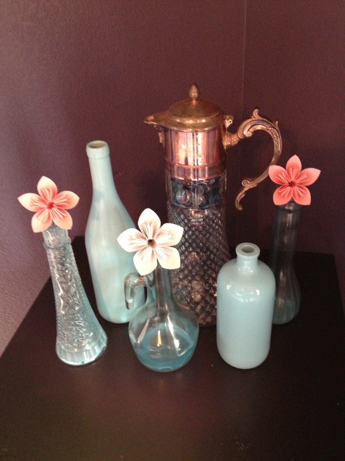I took some other jars I'd spray painted and stuck them all together, adding some little paper flowers I had made ages ago and a neat glass jug I found at a yard sale (which I ended up getting for free, no lie). This project was fun but probably not worth all the effort!